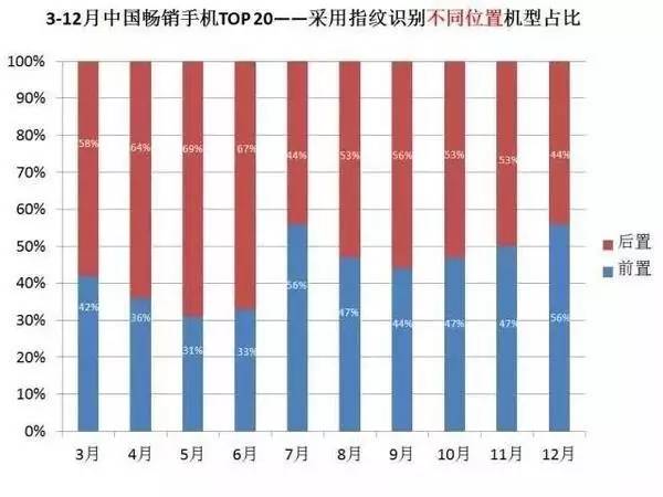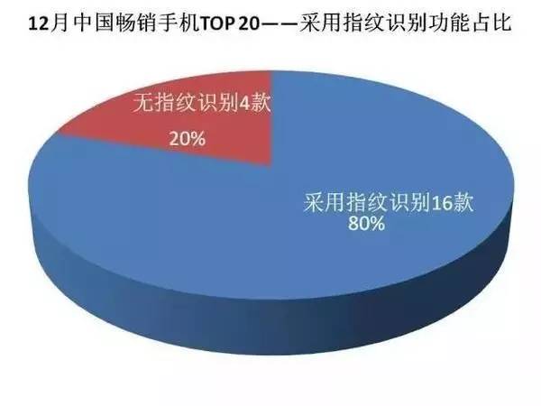 12月中国畅销手机TOP 20,采用指纹识别功能的手机有16款,占比达到80%,相比11月份下降5%,没有采用指纹识别功能的手机有4款,占比为20%,售价全部在1300元以下。
