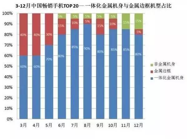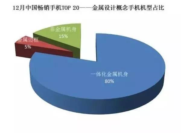 12月中国畅销手机TOP 20,采用一体化金属机身有16款,占比80%,采用金属边框的有1款,占比5%;没有采用金属设计概念的有3款,占比15%,售价均在1300元以下。