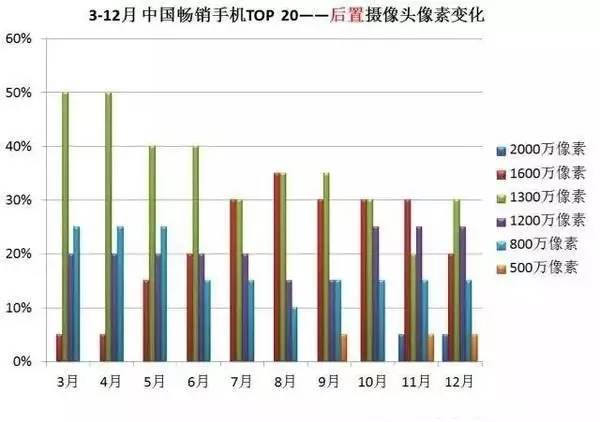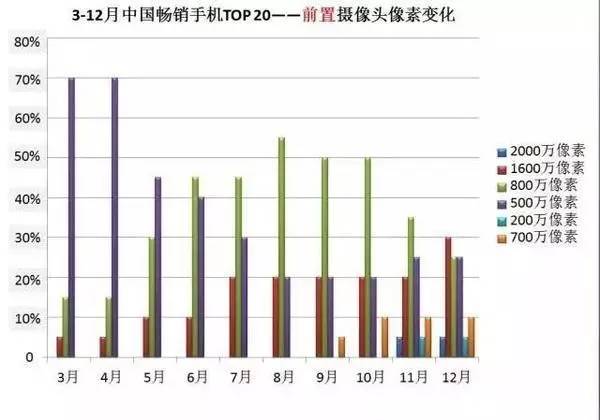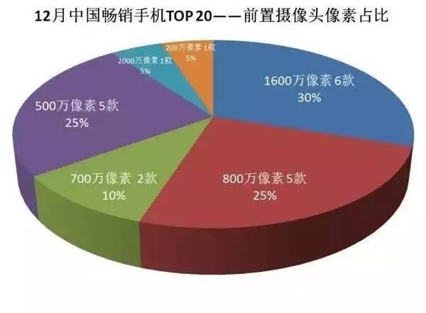 12月中国畅销手机TOP 20中,前置摄像头采用1600万像素的有6款,占比提升至30%;采用800万像素有5款,占比25%。
