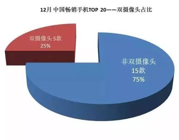 12月中国畅销手机TOP 20中,华为mate9、华为P9、vivo X9、iPhone 7 Plus和荣耀畅玩6X五款采用双摄像头设计,占比上升至25%。