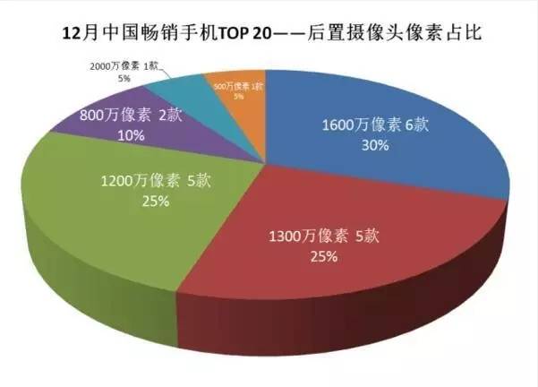 12月畅销手机TOP 20中,后置摄像头采用1600万像素的有4款,占比20%;采用1300万像素的有6款,占比30%。