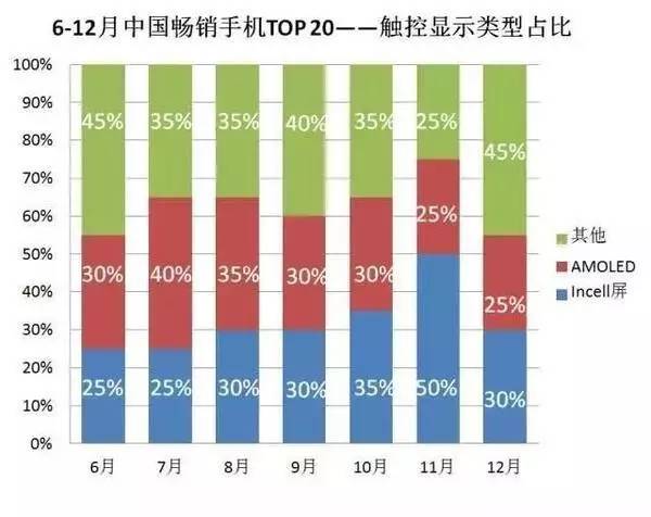 12月中国畅销手机TOP 20中,采用AMOLED屏的为5款,采用incell屏的下降至6款,占比下降至30%。但这一数字并不说明,incell屏不受手机终端欢迎,而只是很多采用incell屏的机型没有进入畅销手机之列,没有畅销的原因,也是因为incell屏的产能局限。