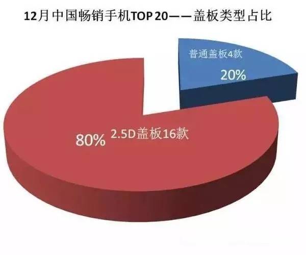 12月中国畅销手机TOP20中采用2.5D玻璃盖板的机型有16款,占比达到80%,相比11月份下降10%。没有采用2.5D玻璃盖板的手机机型有4款,占比为20%,售价全部在1300元以下。